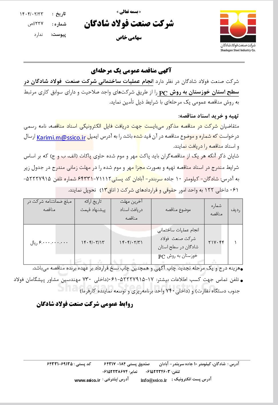 به گزارش فولادنامه له نقل از چیلان، شرکت صنعت فولاد شادگان در نظر دارد انجام عملیات ساختمانی شرکت صنعت فولاد شادگان در سطح استان خوزستان به روش PC را از طریق شرکتهای واجد صلاحیت و دارای سوابق کاری مرتبط به روش مناقصه عمومی یک مرحلهای با شرایط ذیل تأمین نماید.