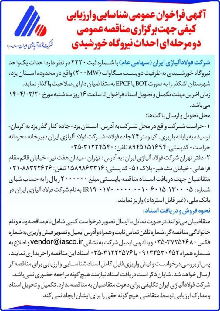 به گزارش فولادنامه به نقل از چیلان، شرکت فولاد آلیاژی ایران (سهامی عام) با انتشار فراخوان عمومی جدید، فرایند شناسایی و ارزیابی کیفی پیمانکاران را بهمنظور برگزاری مناقصه عمومی دو مرحلهای جهت احداث یک نیروگاه خورشیدی ۲۰۰ مگاواتی (MW) در محدوده استان یزد آغاز کرده است.
