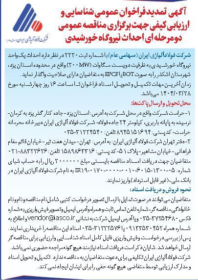 به گزارش فولادنامه به نقل از چیلان، شرکت تولید نیروی برق ایران (سهامی عام) با شماره ثبت ۲۲۳۲۳ در نظر دارد احداث یک واحد نیروگاه خورشیدی به ظرفیت حدود ۱۲ مگاوات (MWp 12) واقع در سایت نیروگاه طوس، واقع در استان خراسان رضوی، شهرستان مشهد، بر اساس قرارداد EPCF، BOT یا سایر قراردادهای متداول، تامین مالی و فاینانس داخلی یا خارجی را از طریق شناسایی و ارزیابی کیفی پیمانکاران واجد شرایط واگذار نماید. مهلت تحویل اسناد شناسایی و ارزیابی کیفی تا ساعت ۱۶ روز چهارشنبه مورخ ۱۴۰۴/۰۳/۲۳ تمدید گردیده است.