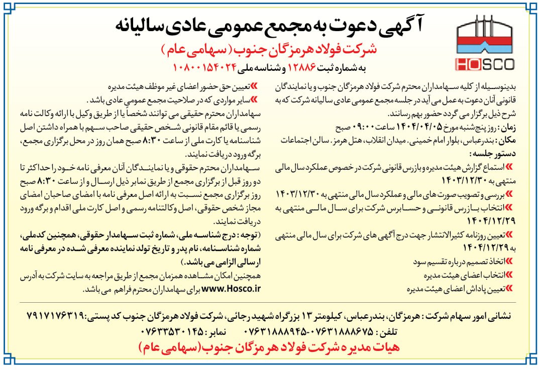 به گزارش فولادنامه، بدینوسیله از کلیه سهامداران محترم شرکت فولاد هرمزگان جنوب و یا نمایندگان قانونی آنان دعوت به عمل می آید در جلسه مجمع عمومی عادی سالیانه شرکت که به شرح ذیل برگزار می گردد حضور بهم رسانند.