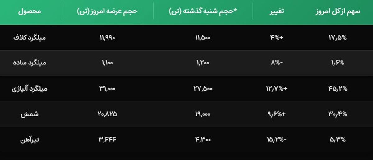 میلگرد کلاف با حدود ۱۱ هزار و ۹۹۰ تن عرضه، تغییر اندکی را نسبت به هفته گذشته به ثبت رساند و سهمی نزدیک به ۱۸ درصد در عرضه کل داشت. در مقابل، دو محصول اصلی سازهای یعنی میلگرد ساده و تیرآهن کاهش عرضه را تجربه کردند؛ میلگرد ساده با افت حدود ۸ درصدی و تیرآهن با ریزش بیش از ۱۵ درصد نشان دادند که بخش ساختمان، بهخصوص پروژههای عمرانی بزرگ، شاید فعلاً با احتیاط بیشتری در سمت تقاضا حرکت میکند.