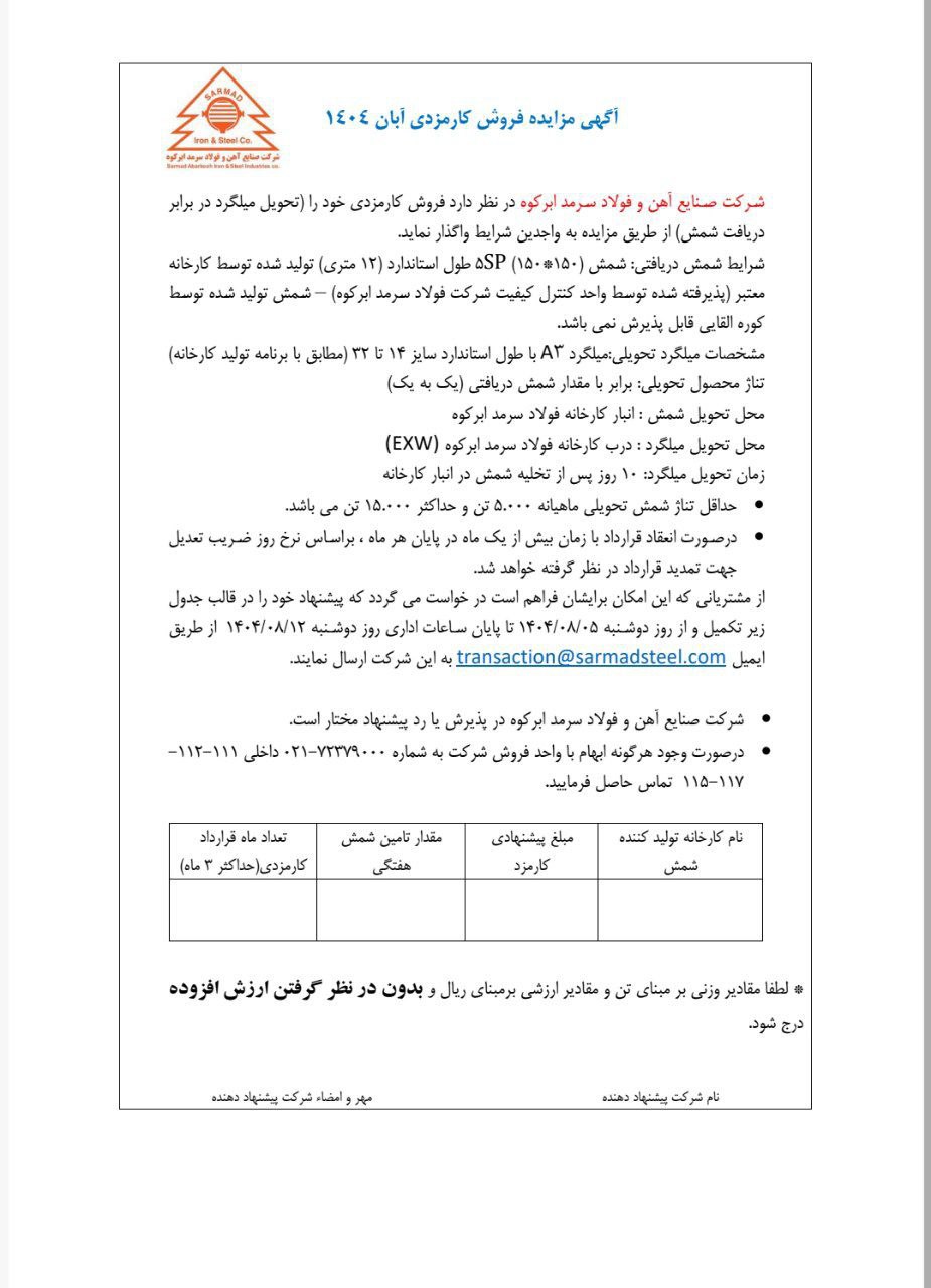 آگهی مزایده فروش کارمزدی ویژه آبان ماه ۱۴۰۴ فولاد سرمد ابرکوه