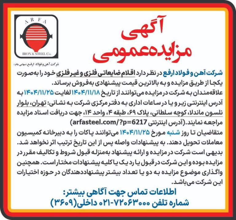به گزارش فولادنامه به نقل از روابط عمومی شرکت آهن و فولاد ارفع، علاقه مندان به شرکت در مزایده میتوانند از تاریخ ۱۴۰۴٫۱۱٫۱۸ لغایت ۱۴۰۴٫۱۱٫۲۵ به آدرس اینترنتی https://arfasteel.com/?p=6217 و یا در ساعات اداری به دفتر مرکزی شرکت به نشانی تهران بلوار نلسون ماندلا کوچه سلطانی، پلاک ۶۹ طبقه ۴ واحد ۱۴ جهت دریافت اسناد مزایده مراجعه نمایند.